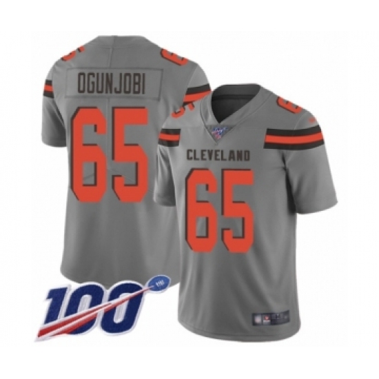 >Men's Cleveland Browns #65 Larry Ogunjobi Limited Gray Inverted Legend 100th Season Football Jersey