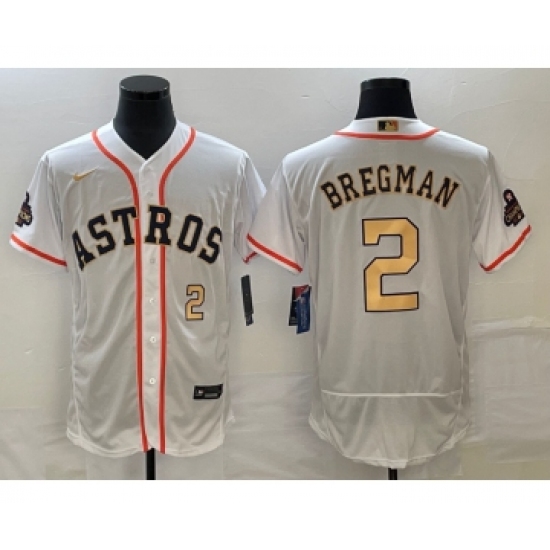 >Men's Houston Astros #2 Alex Bregman Number 2023 White Gold World Serise Champions Flex Base Stitched Jersey2