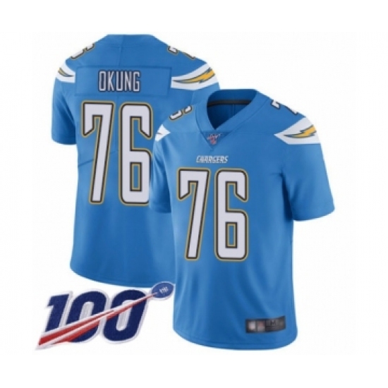 >Men's Los Angeles Chargers #76 Russell Okung Electric Blue Alternate Vapor Untouchable Limited Player 100th Season Football Jersey