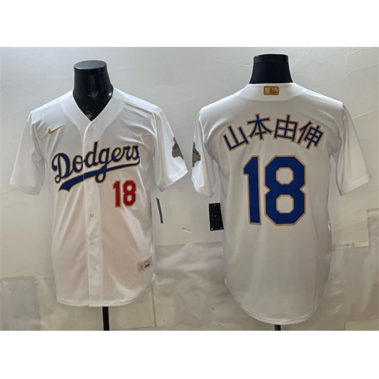 >Men's Los Angeles Dodgers #18 山本由伸 White 2026 Gold Collection Stadium Stitched Baseball Jersey