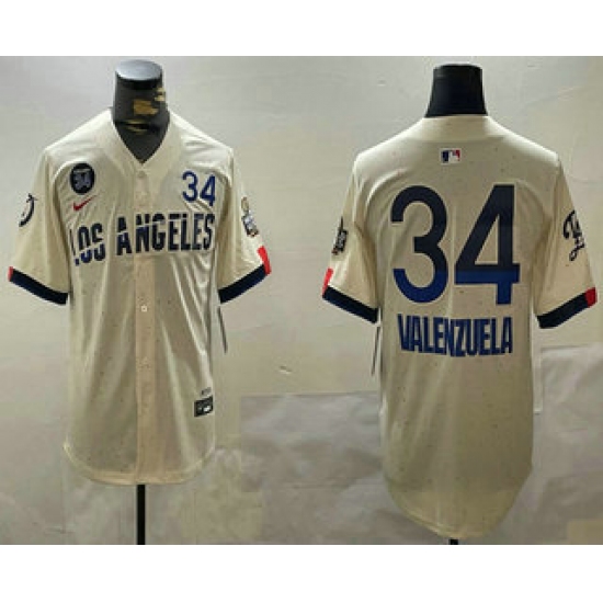 Men's Los Angeles Dodgers #34 Fernando Valenzuela Number Cream 2024 World Series City Connect Limited Stitched Jersey
