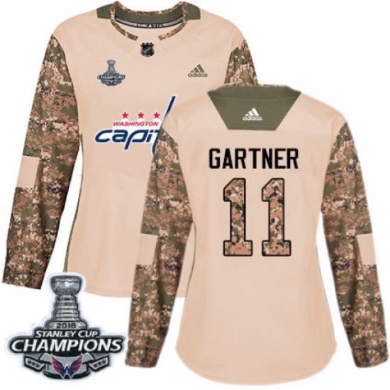 >Women's Adidas Washington Capitals #11 Mike Gartner Authentic Camo Veterans Day Practice 2018 Stanley Cup Final Champions NHL Jersey