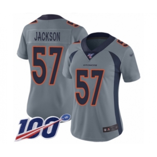 >Women's Denver Broncos #57 Tom Jackson Limited Silver Inverted Legend 100th Season Football Jersey
