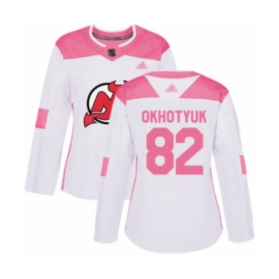 >Women's New Jersey Devils #82 Nikita Okhotyuk Authentic White Pink Fashion Hockey Jersey