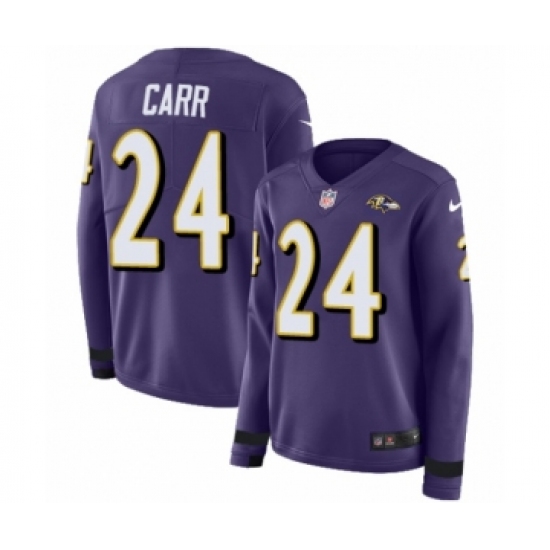 Women's Nike Baltimore Ravens #24 Brandon Carr Limited Purple Therma Long Sleeve NFL Jersey