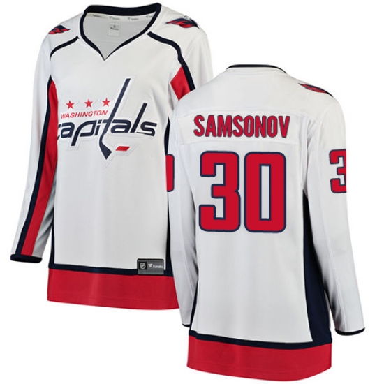 Home>NHL>Washington Capitals>Ilya Samsonov>Women's Washington Capitals #30 Ilya Samsonov Fanatics Branded White Away Breakaway NHL Jersey