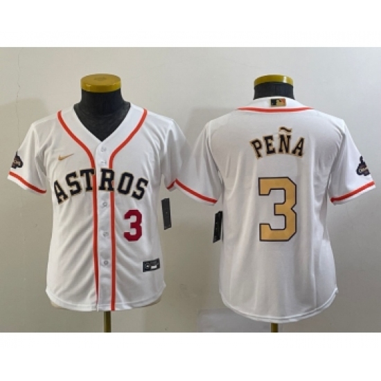 >Youth Houston Astros #3 Jeremy Pena Number 2023 White Gold World Serise Champions Cool Base Stitched Jerseys