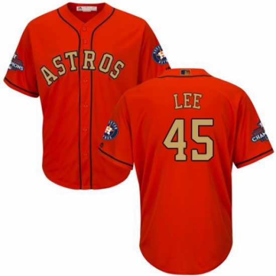 >Youth Majestic Houston Astros #45 Carlos Lee Authentic Orange Alternate 2018 Gold Program Cool Base MLB Jersey