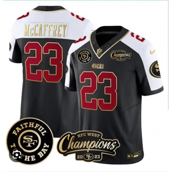 Men San Francisco 49ers #23 Christian McCaffrey White Balck 2023 F U S E With 3 Star And Faithful To The Bay Stitched Football Jersey