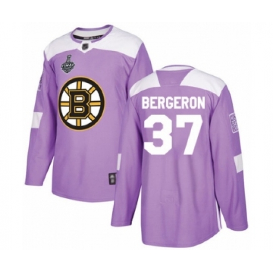 >Men's Boston Bruins #37 Patrice Bergeron Authentic Purple Fights Cancer Practice 2019 Stanley Cup Final Bound Hockey Jersey