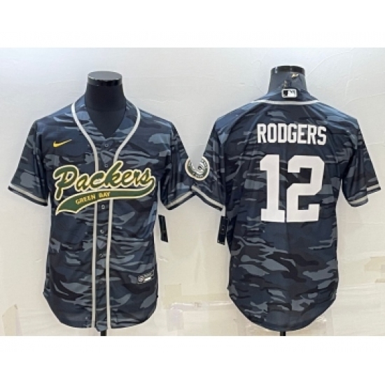 >Men's Green Bay Packers #12 Aaron Rodgers Grey Camo With Patch Cool Base Stitched Baseball Jersey