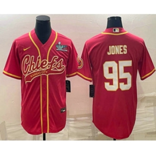 >Men's Kansas City Chiefs #95 Chris Jones Red With Super Bowl LVII Patch Cool Base Stitched Baseball Jersey