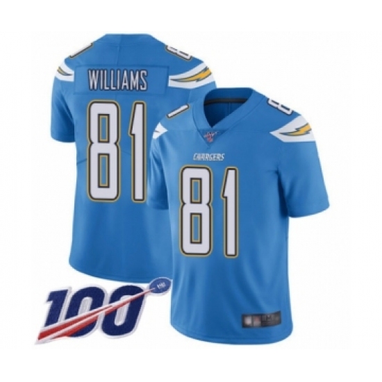 >Men's Los Angeles Chargers #81 Mike Williams Electric Blue Alternate Vapor Untouchable Limited Player 100th Season Football Jersey