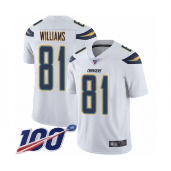 >Men's Los Angeles Chargers #81 Mike Williams White Vapor Untouchable Limited Player 100th Season Football Jersey