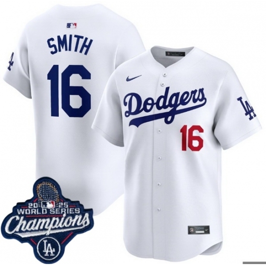 >Men's Los Angeles Dodgers 16 Will Smith Cool Base 2025 World Champions Stitched Baseball Jersey White