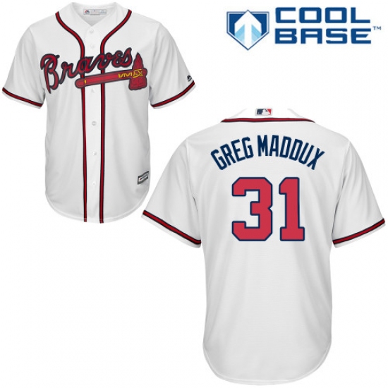 Home>MLB>Atlanta Braves>Greg Maddux>Men's Majestic Atlanta Braves #31 Greg Maddux Replica White Home Cool Base MLB Jersey
