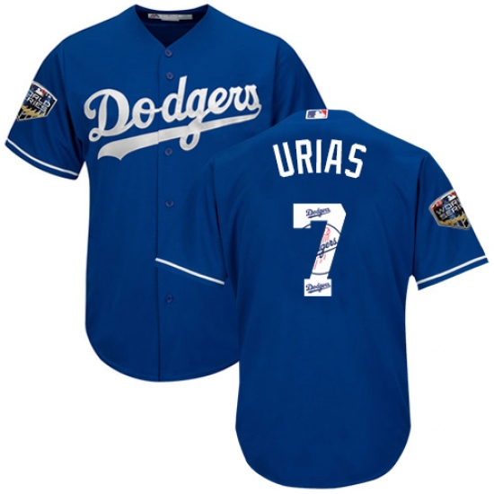 >Men's Majestic Los Angeles Dodgers #7 Julio Urias Authentic Royal Blue Team Logo Fashion Cool Base 2018 World Series MLB Jersey