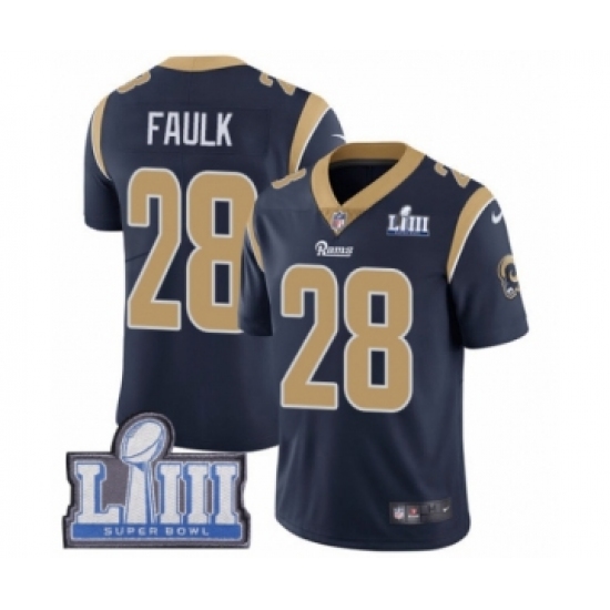 >Men's Nike Los Angeles Rams #28 Marshall Faulk Navy Blue Team Color Vapor Untouchable Limited Player Super Bowl LIII Bound NFL Jersey
