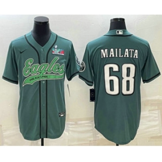 Men's Philadelphia Eagles #68 Jordan Mailata Green With Super Bowl LVII Patch Cool Base Stitched Baseball Jersey