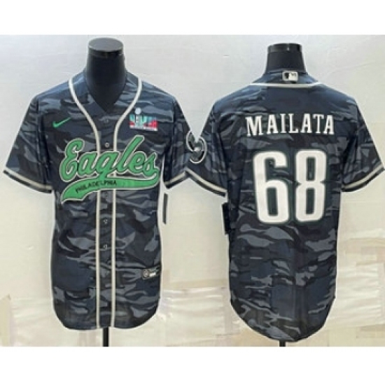>Men's Philadelphia Eagles #68 Jordan Mailata Grey Camo With Super Bowl LVII Patch Cool Base Stitched Baseball Jersey