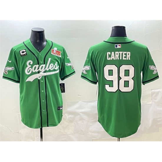 Men's Philadelphia Eagles #98 Jalen Carter Green 2025 Super Bowl LIX And 3-Star C Stitched Baseball Jersey
