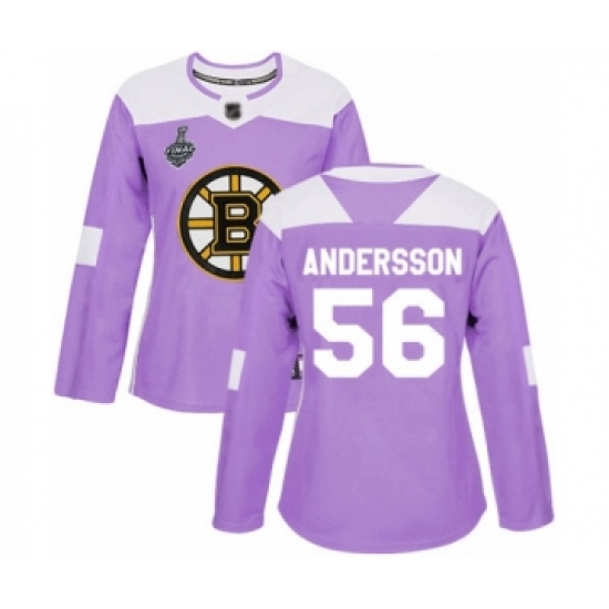 >Women's Boston Bruins #56 Axel Andersson Authentic Purple Fights Cancer Practice 2019 Stanley Cup Final Bound Hockey Jersey