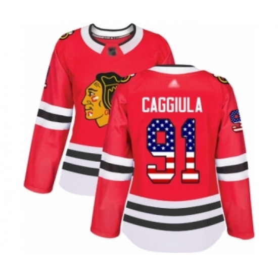 Women's Chicago Blackhawks #91 Drake Caggiula Authentic Red USA Flag Fashion Hockey Jersey