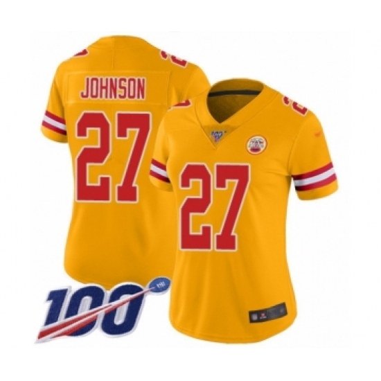 >Women's Kansas City Chiefs #27 Larry Johnson Limited Gold Inverted Legend 100th Season Football Jersey