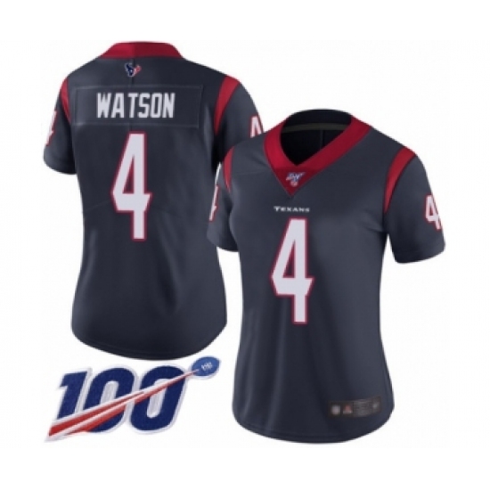 >Women's Nike Houston Texans #4 Deshaun Watson Navy Blue Team Color Vapor Untouchable Limited Player 100th Season NFL Jersey