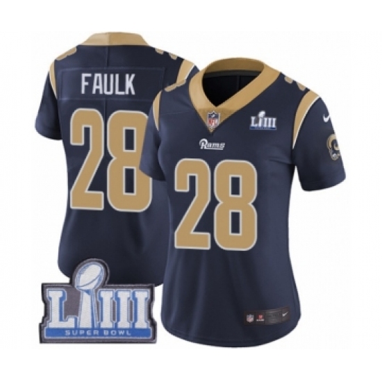 >Women's Nike Los Angeles Rams #28 Marshall Faulk Navy Blue Team Color Vapor Untouchable Limited Player Super Bowl LIII Bound NFL Jersey