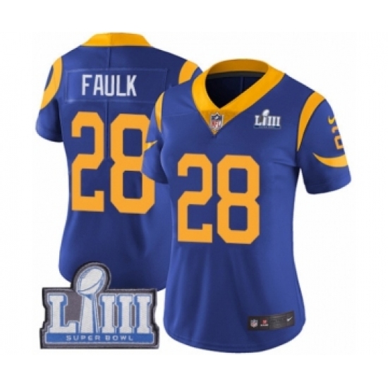 >Women's Nike Los Angeles Rams #28 Marshall Faulk Royal Blue Alternate Vapor Untouchable Limited Player Super Bowl LIII Bound NFL Jersey