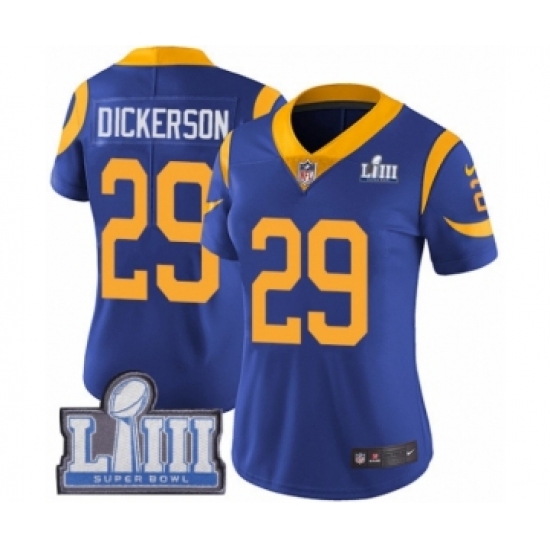 >Women's Nike Los Angeles Rams #29 Eric Dickerson Royal Blue Alternate Vapor Untouchable Limited Player Super Bowl LIII Bound NFL Jersey