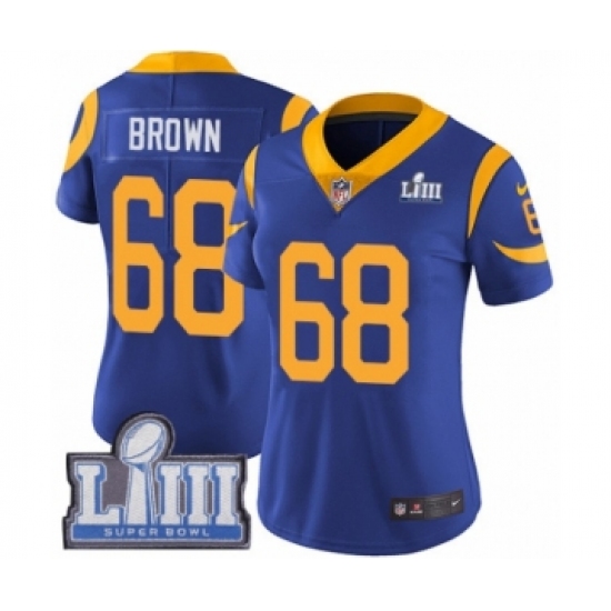 >Women's Nike Los Angeles Rams #68 Jamon Brown Royal Blue Alternate Vapor Untouchable Limited Player Super Bowl LIII Bound NFL Jersey