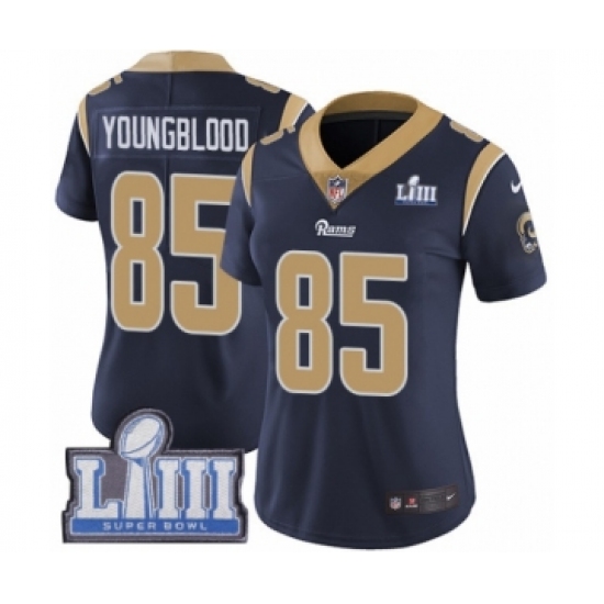 >Women's Nike Los Angeles Rams #85 Jack Youngblood Navy Blue Team Color Vapor Untouchable Limited Player Super Bowl LIII Bound NFL Jersey