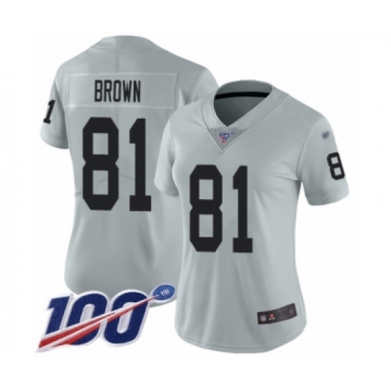 >Women's Oakland Raiders #81 Tim Brown Limited Silver Inverted Legend 100th Season Football Jersey
