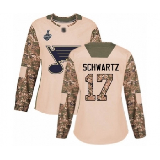 >Women's St. Louis Blues #17 Jaden Schwartz Authentic Camo Veterans Day Practice 2019 Stanley Cup Final Bound Hockey Jersey