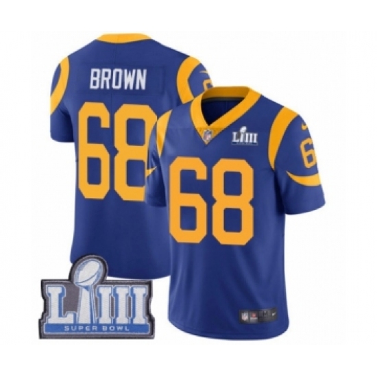 >Youth Nike Los Angeles Rams #68 Jamon Brown Royal Blue Alternate Vapor Untouchable Limited Player Super Bowl LIII Bound NFL Jersey